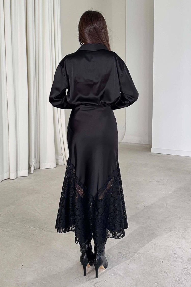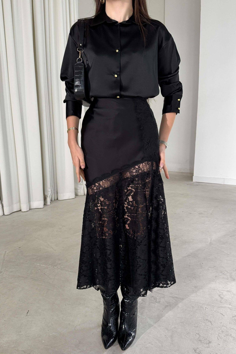 - Model ima visok struk, zvonast kroj, satenski materijal i čipku.