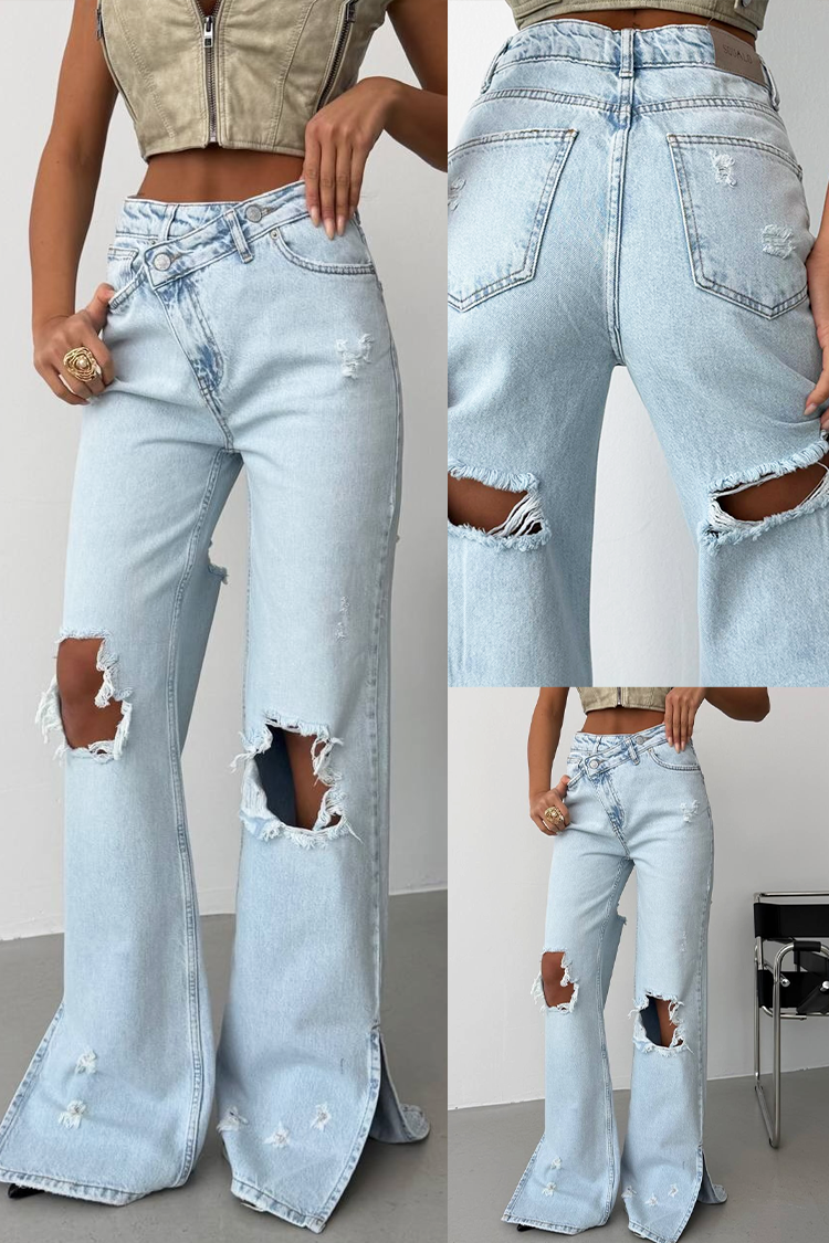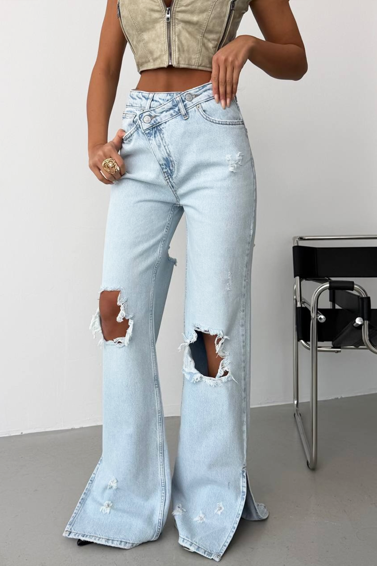 • Model ima moderno asimetrično kopčanje i efektne pocepane detalje.
