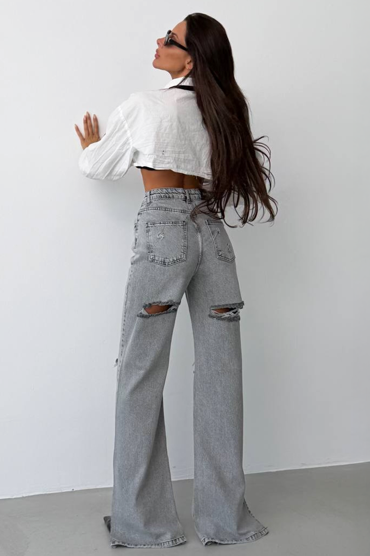 - Model ima moderno asimetrično kopčanje i efektne pocepane detalje.