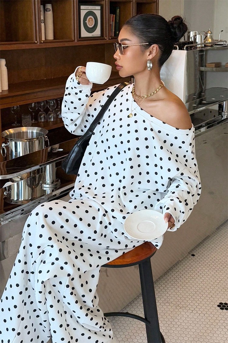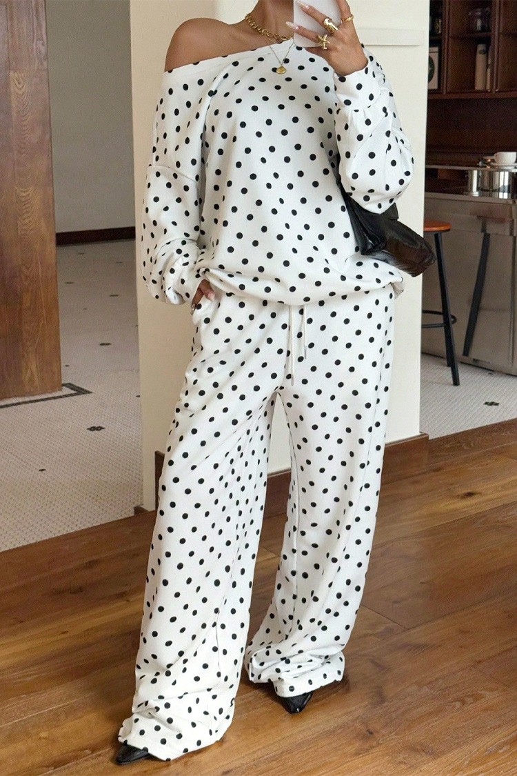 - Bluza ima oversize kroj, tufnasti dezen, a pantalone imaju širok dizajn i visok struk.