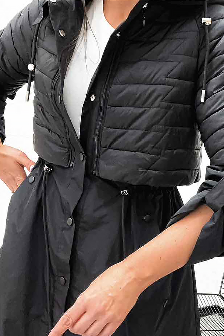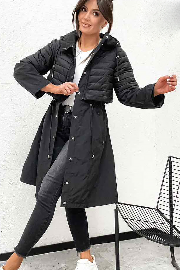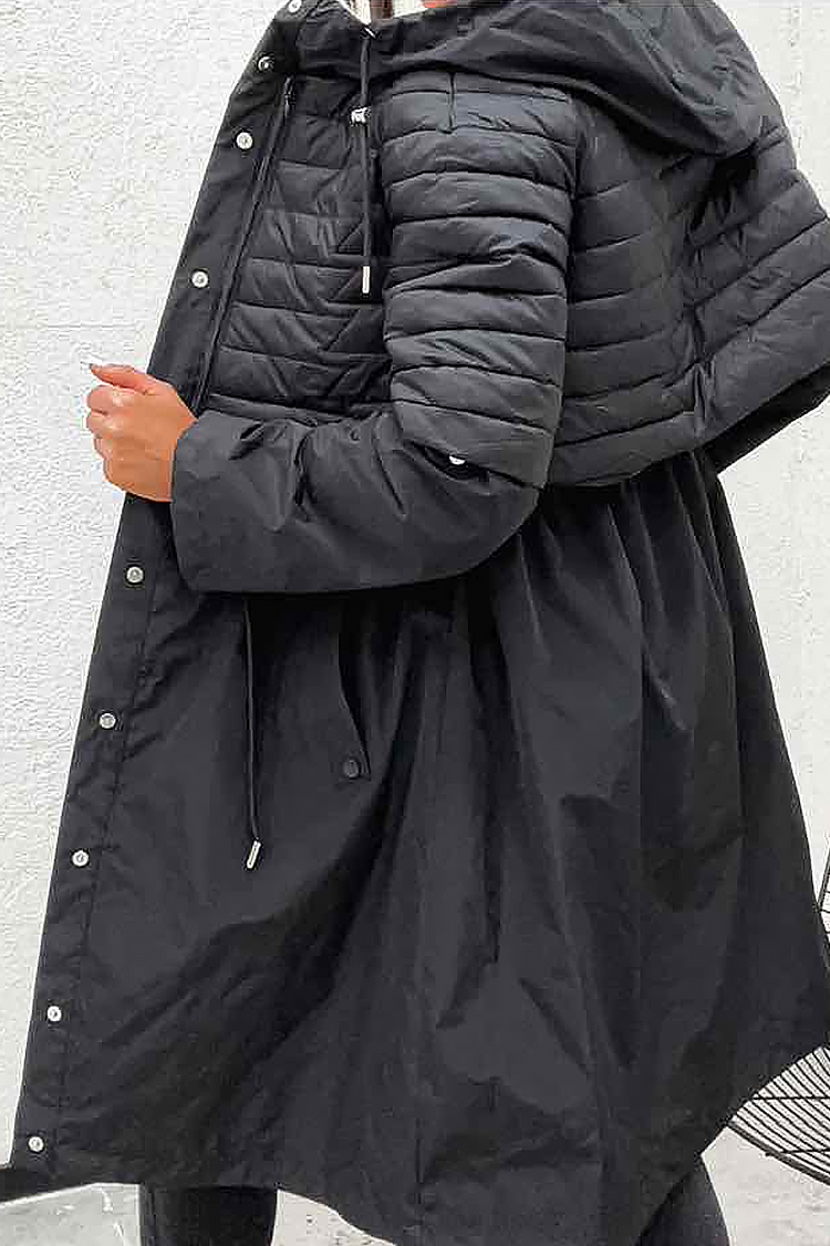 - Model ima kapuljaču, dugmad celom dužinom prednje strane, trendi kombinovanu tkaninu i bočne džepove.