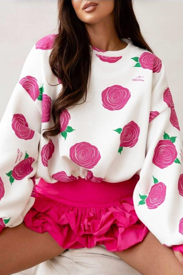 - Model ima duge rukave, labav kroj i trendi dezen ruže.