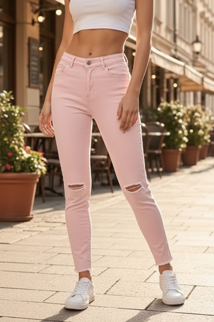 • Model ima uski kroj, puder boju, visok struk i moderan pocepani efekat.
