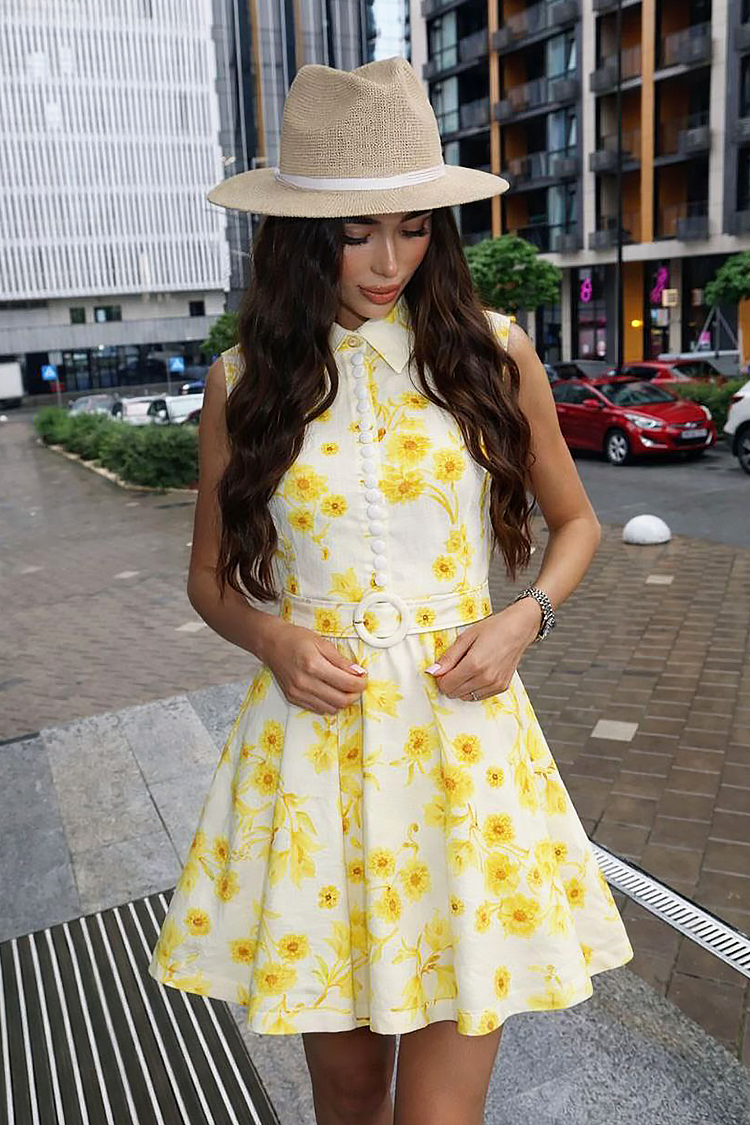 - Model ima kratku dužinu, kragnu, dugmad, cvetni dezen i kaiš od iste tkanine.