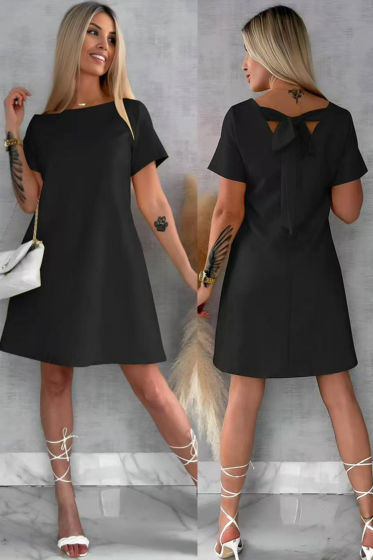 • Haljina ima ležeran kroj, kratke rukave i trendi akcenat na leđima sa mašnom.