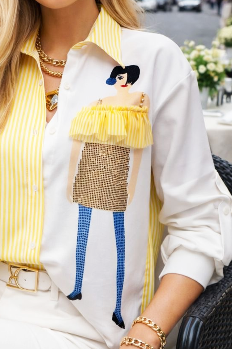 - Model ima dugmad, kragnu, klasičan dizajn, kontrastne boje i print sa jedne strane.