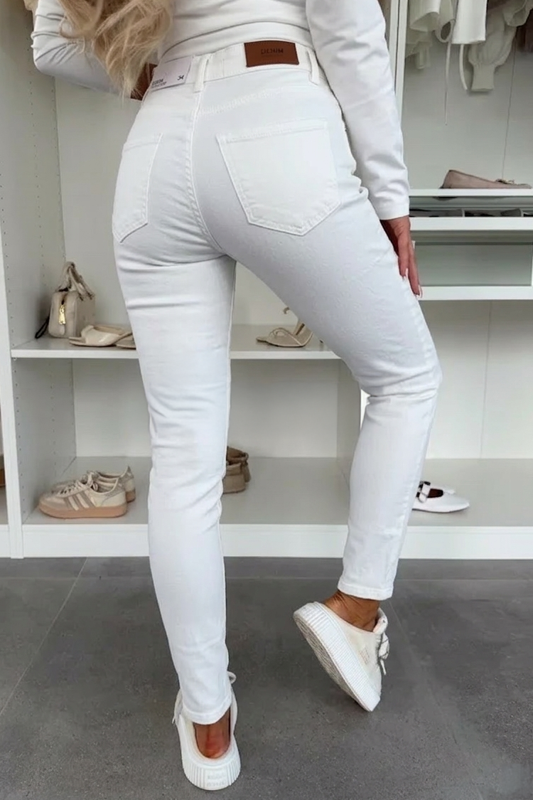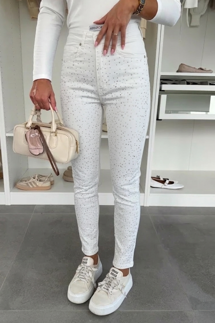 - Model ima visok struk, uski kroj, belu boju i sjajne akcente celom dužinom.