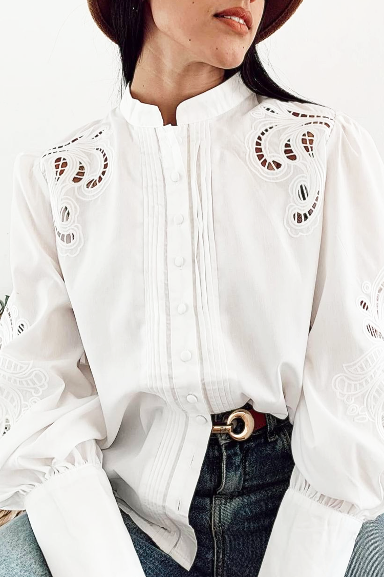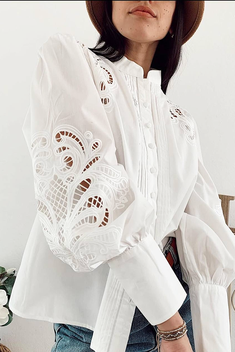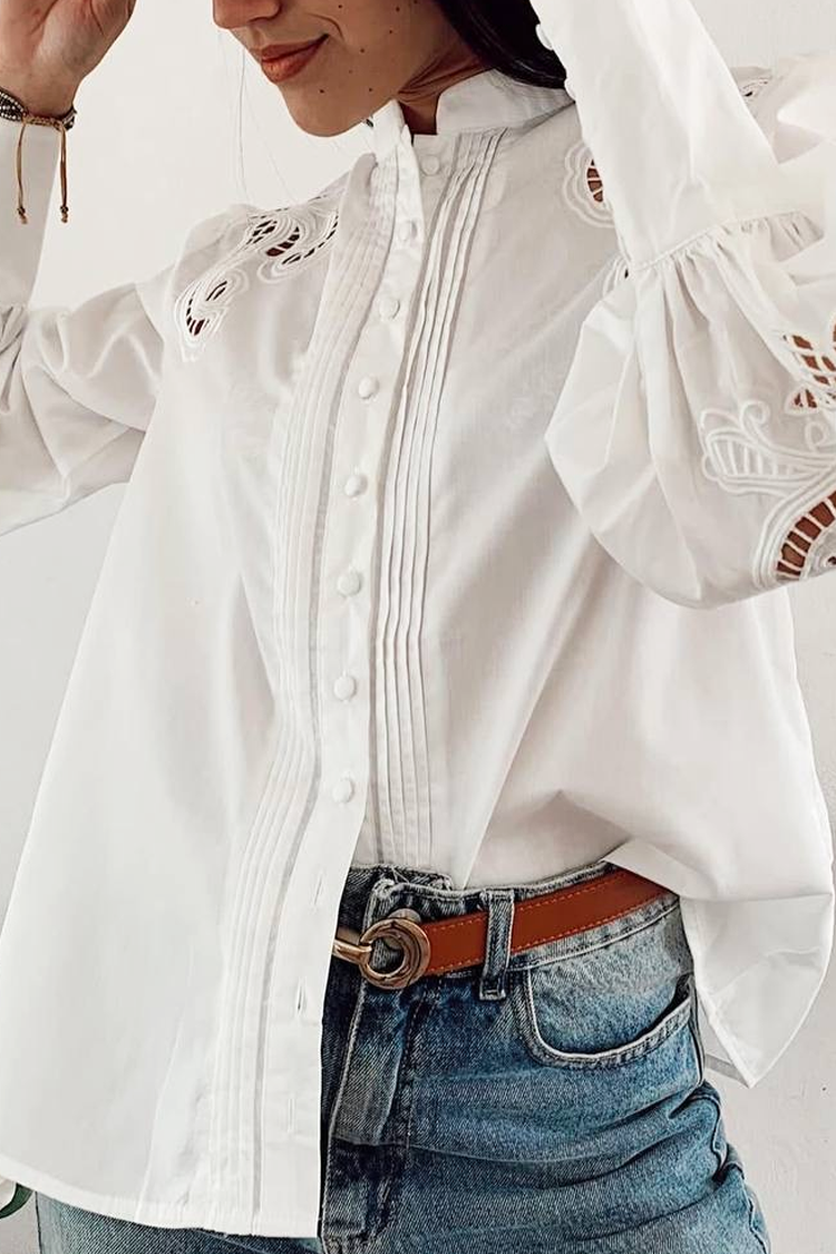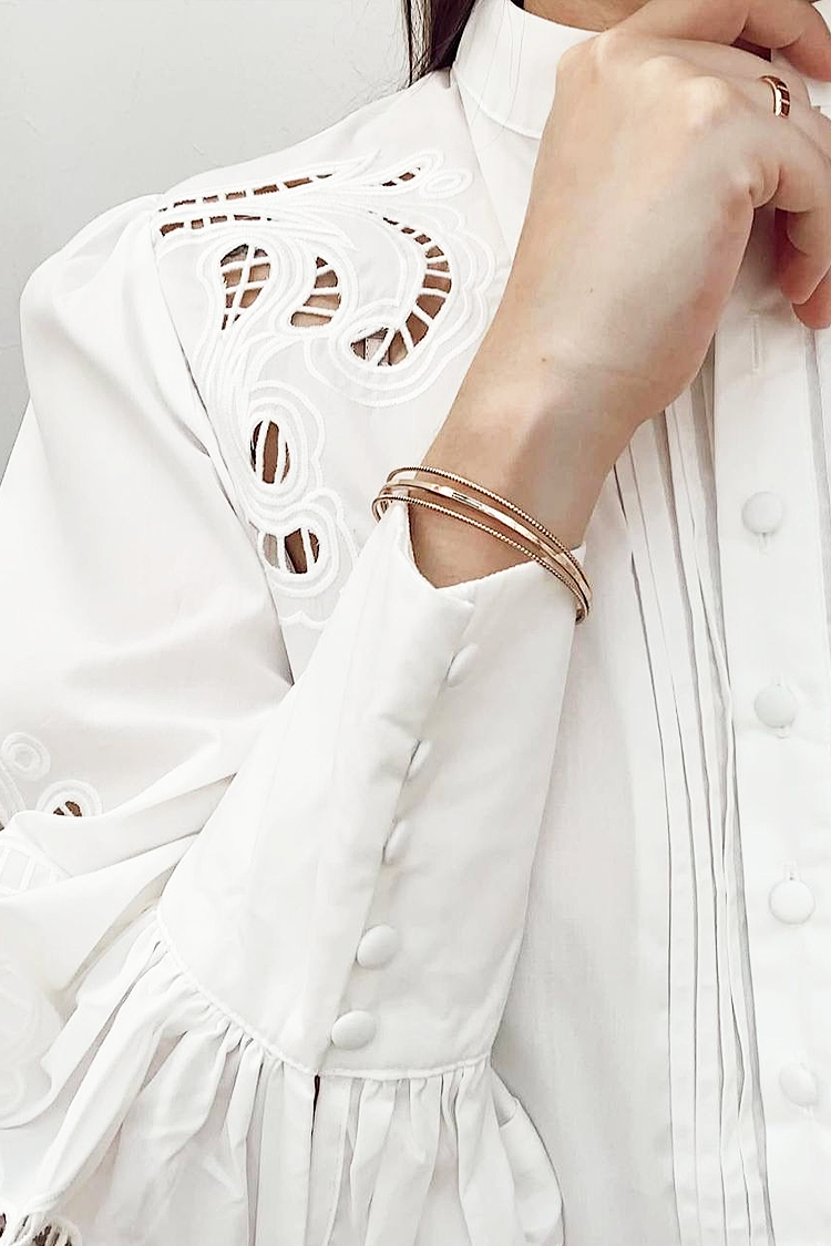 - Model ima dugmad celom dužinom, kragnu, klasičan dizajn i rukave sa trendi vezom.