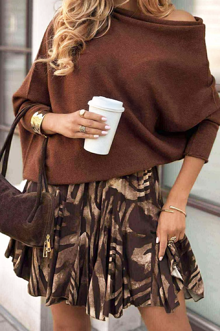 - Model ima visok struk, trendi dezen, braon boju, mini dužinu i volane.