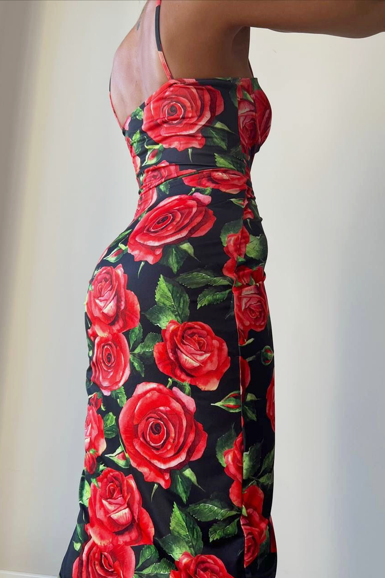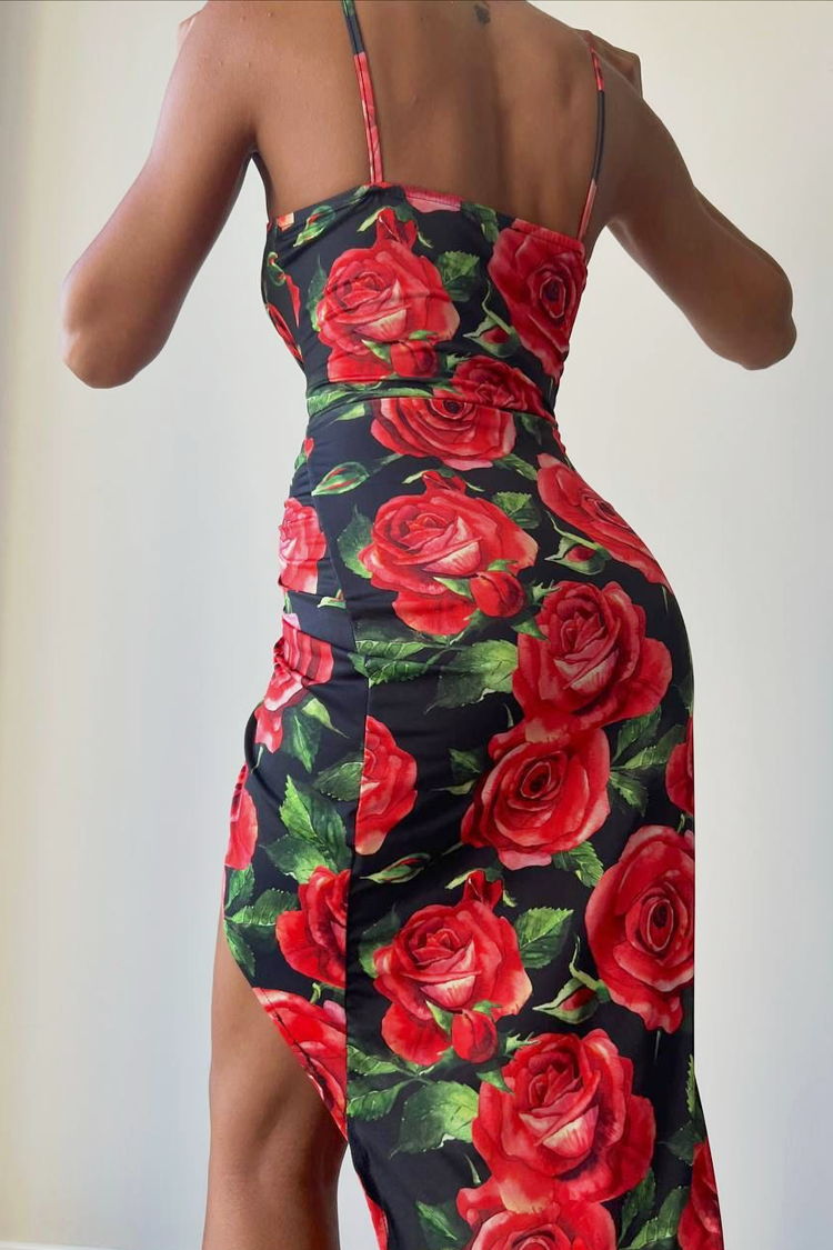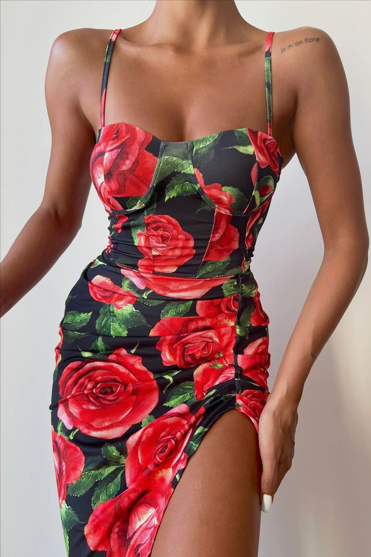 - Model ima uski kroj, šlic napred, tanke bretele i cvetni dezen.