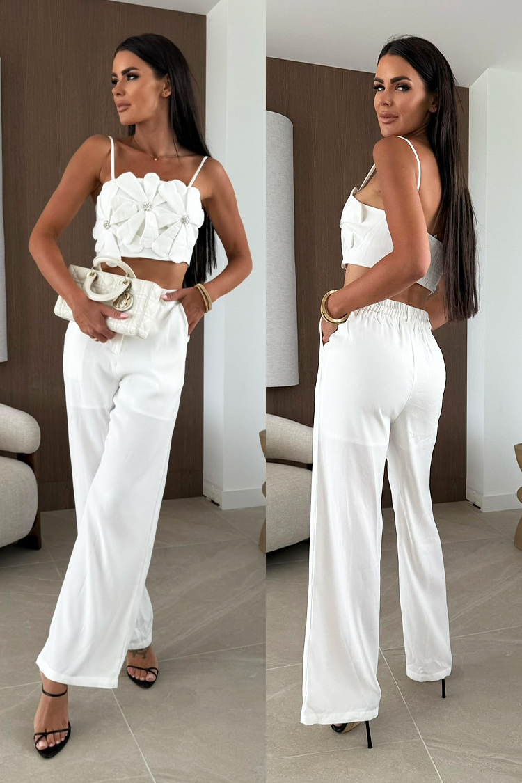 - Gornji deo je krop top sa trendi cvećem, donji deo su pantalone ravnog kroja.