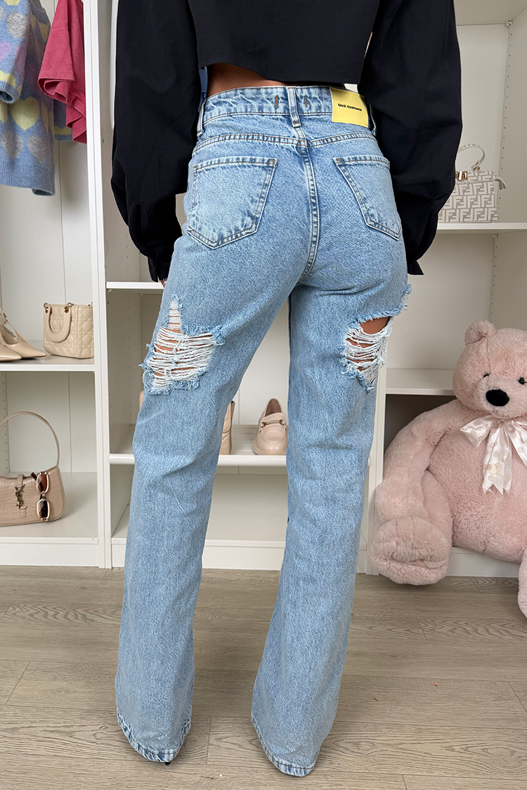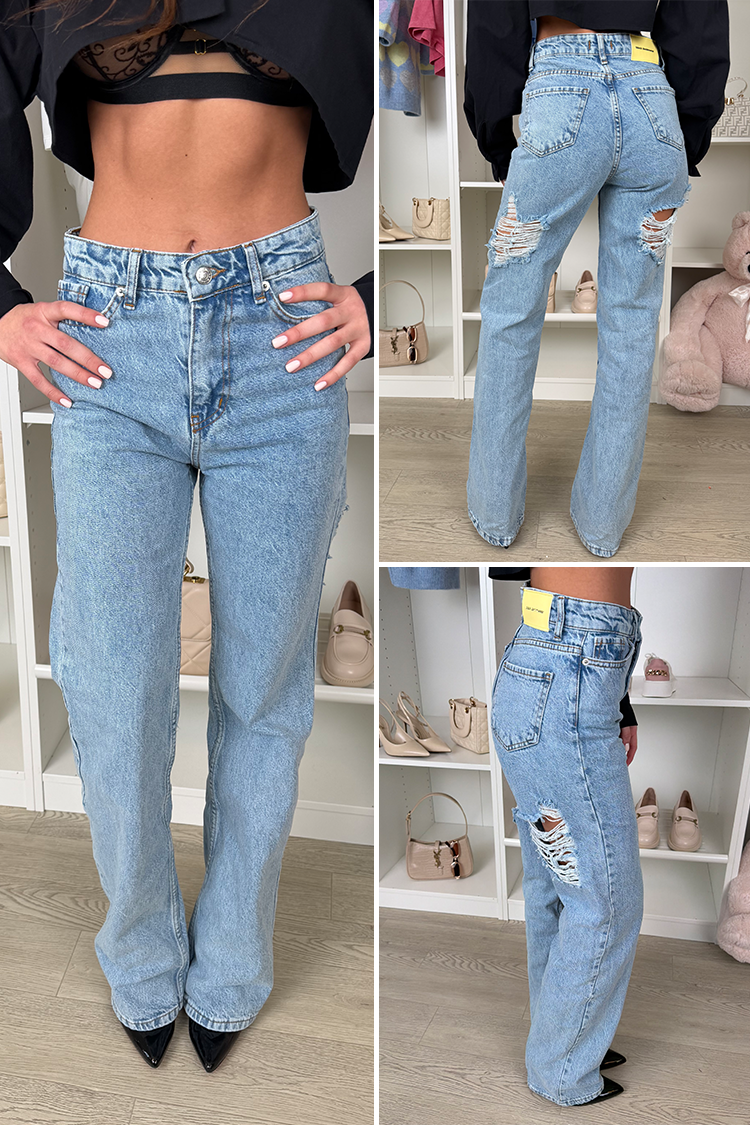 - Model ima visok struk, ravan kroj, seksi pocepane detalje na leđima i plavi dezen.