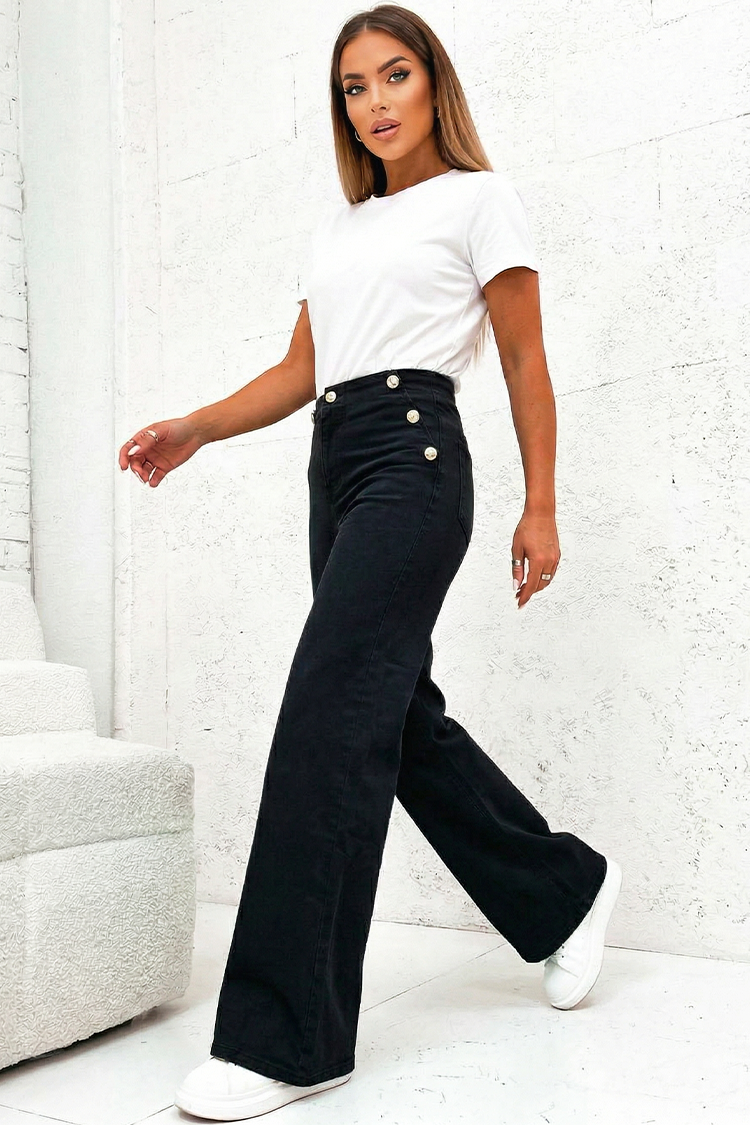 • Model ima visok struk, široke nogavice i efektnu dugmad sa obe strane.