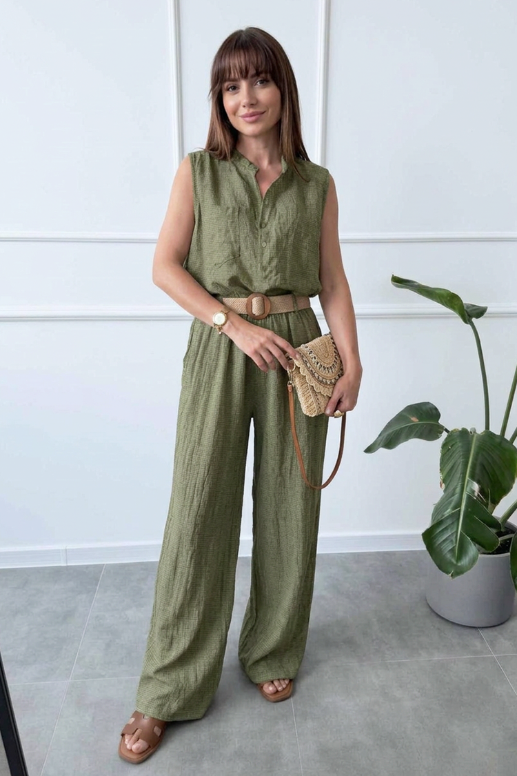 - Ženska košulja slobodnog kroja, bez rukava i sa dugmadima celom dužinom, pruža udobnost i eleganciju.