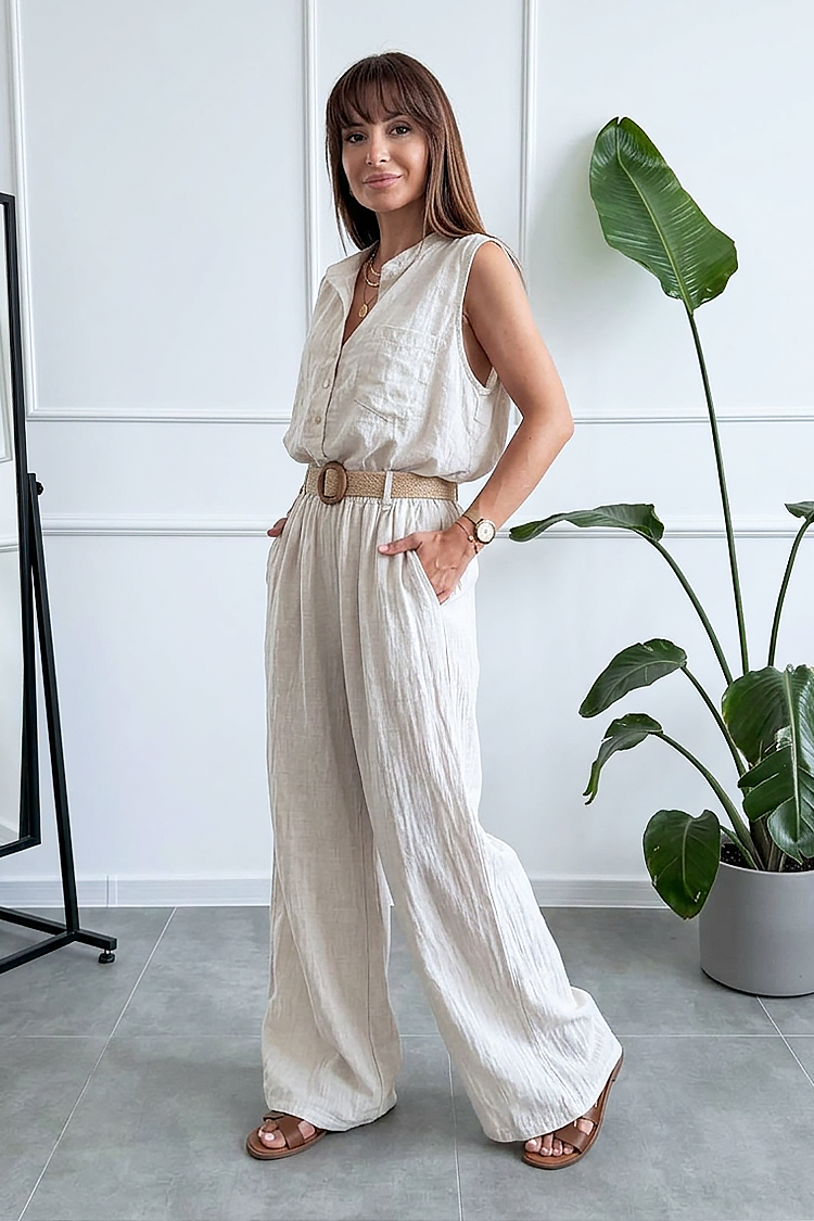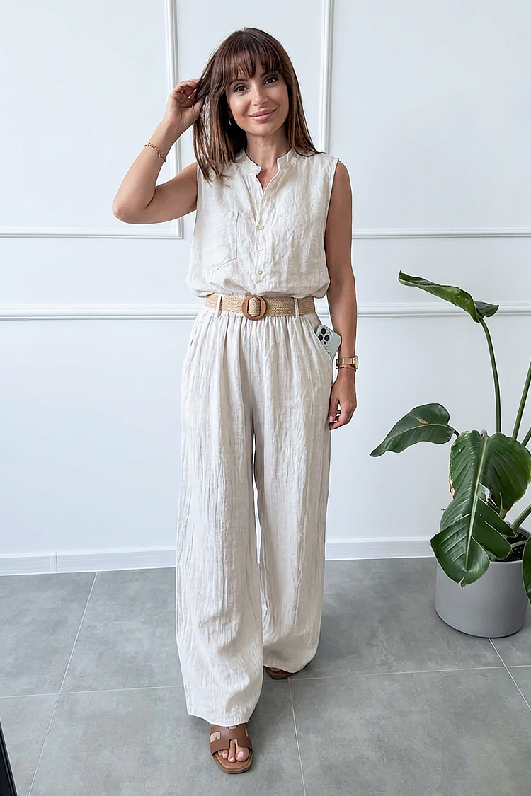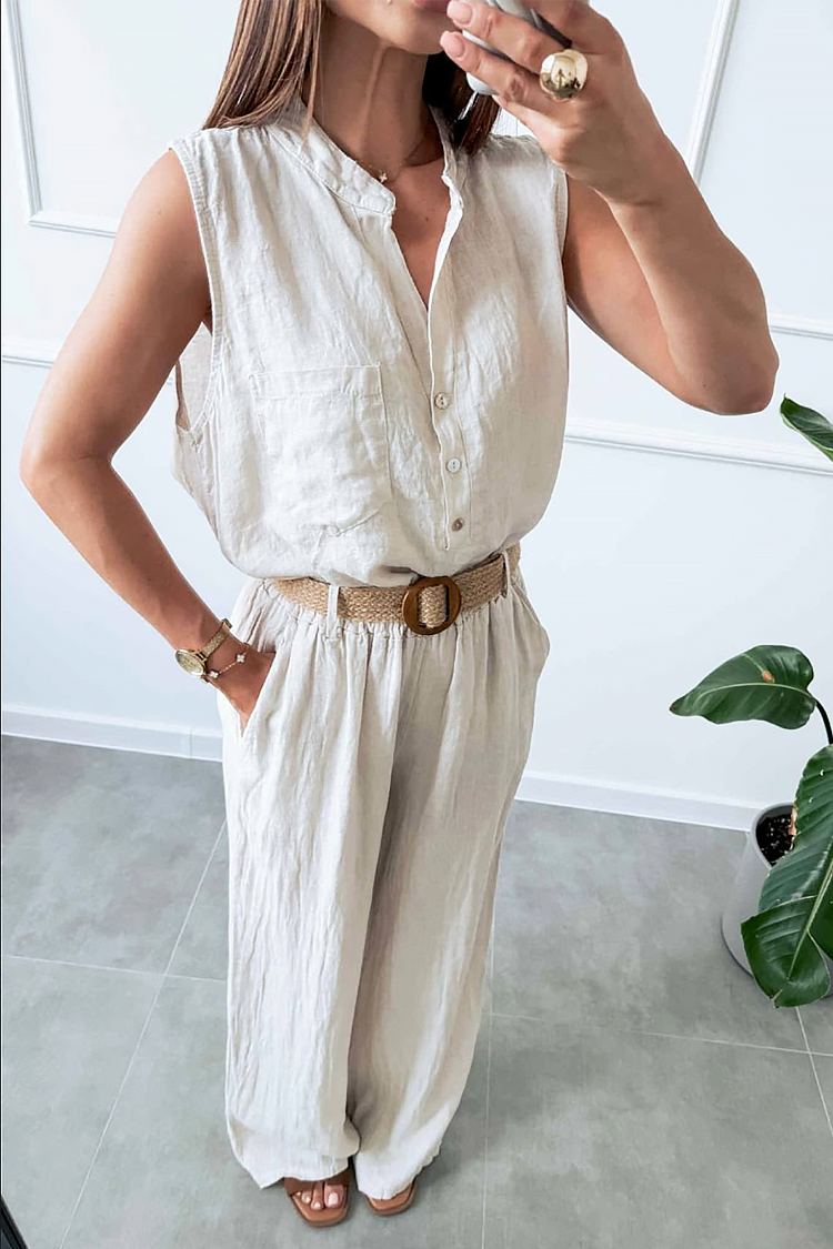- Ženska košulja slobodnog kroja, bez rukava i sa dugmadima celom dužinom, pruža udobnost i eleganciju.