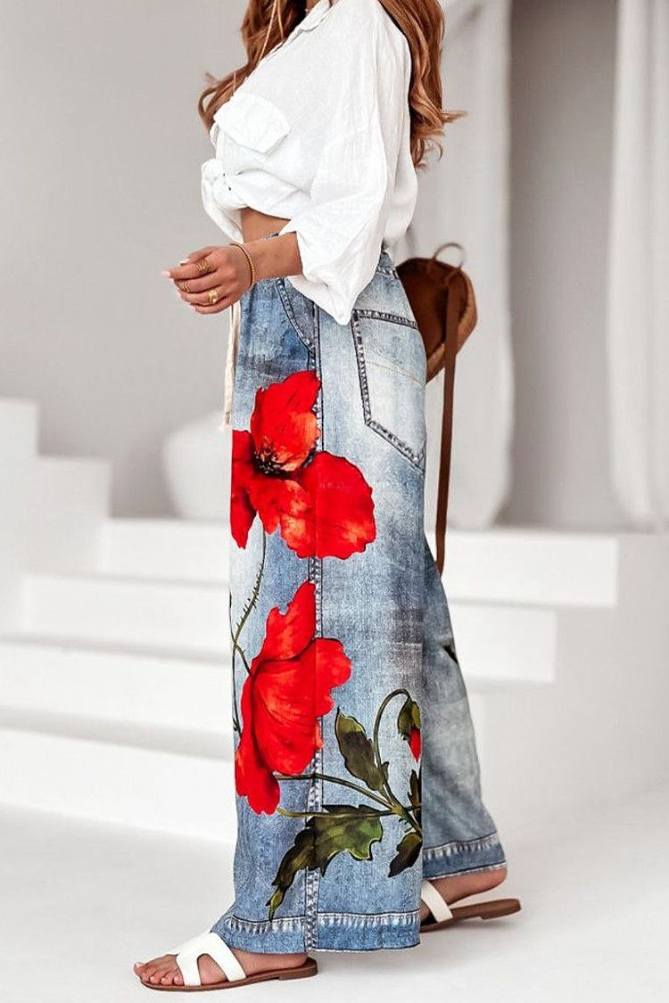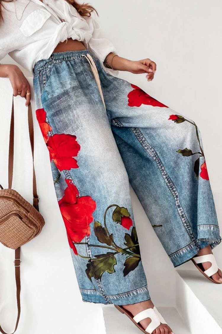 - Model ima visok i elastičan struk, podesive vezice, cvetni dezen i bočne džepove.
