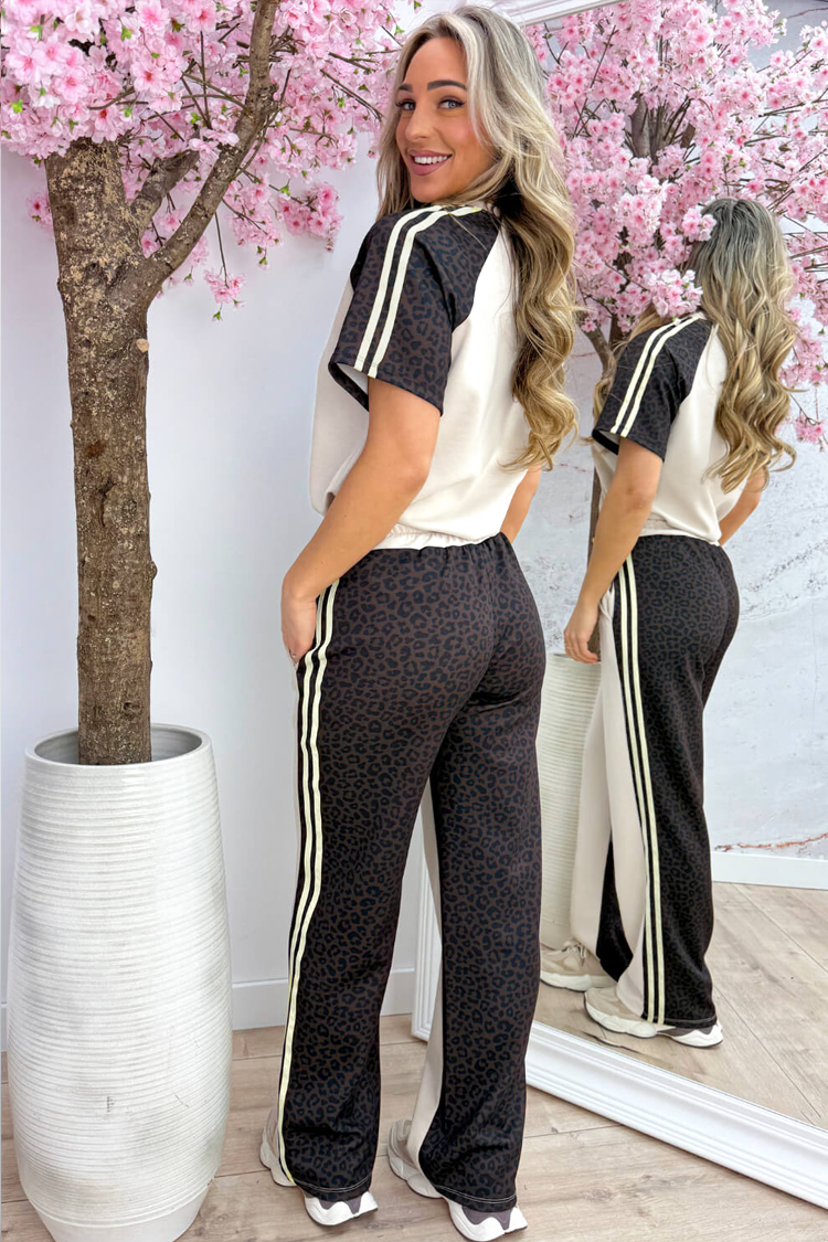 • Majica ima klasičan, okrugli dekolte i oversize kroj sa leopard printom.