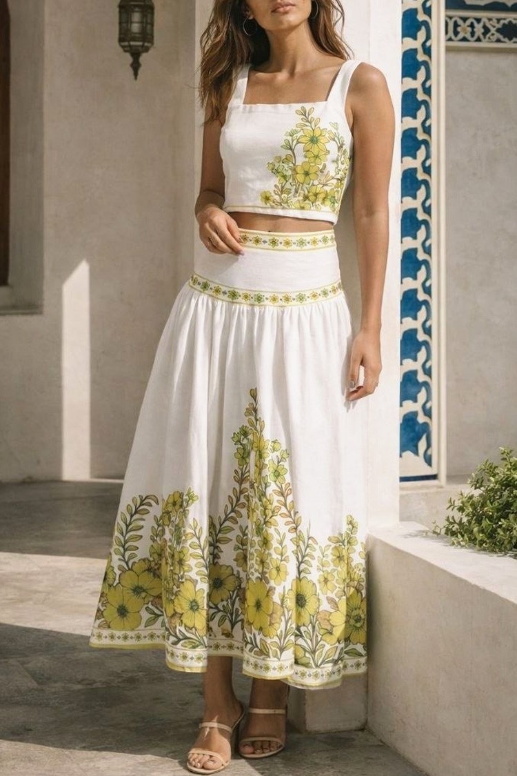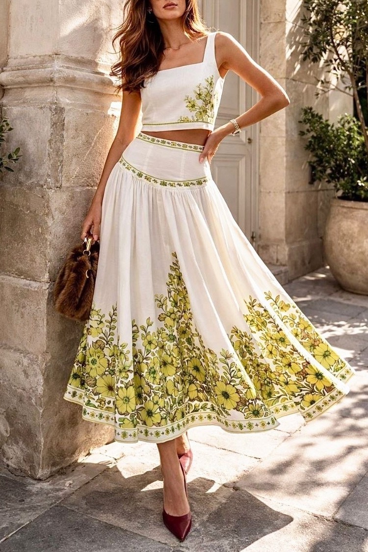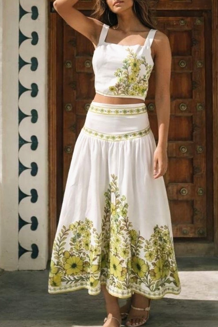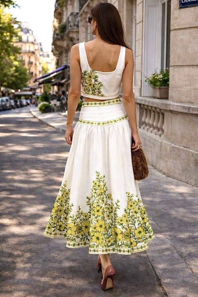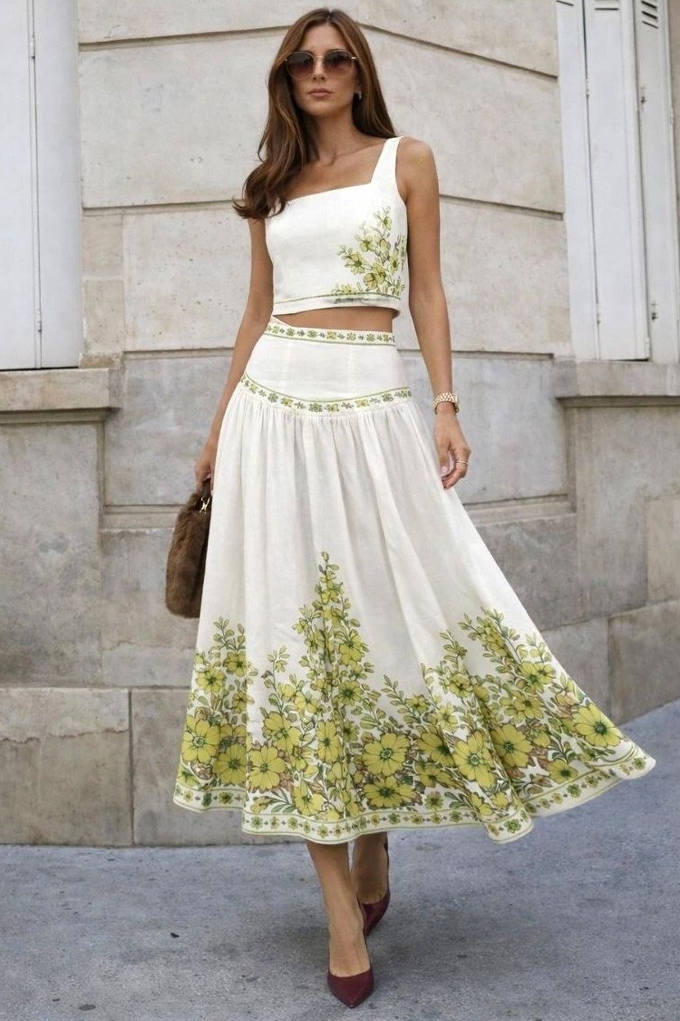 - Za samouveren, besprekoran i moderan izgled, verujte ovom dvodelnom pamučnom setu - midi suknji i kratkom topu.