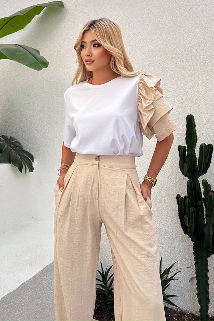 - Kombinacija prozračnih pantalona visokog struka i bluze sa akcentnim rukavom stvara izgled koji je istovremeno minimalistički i nezaboravan. Silueta ističe ženstvenost na prirodan i nenametljiv način.