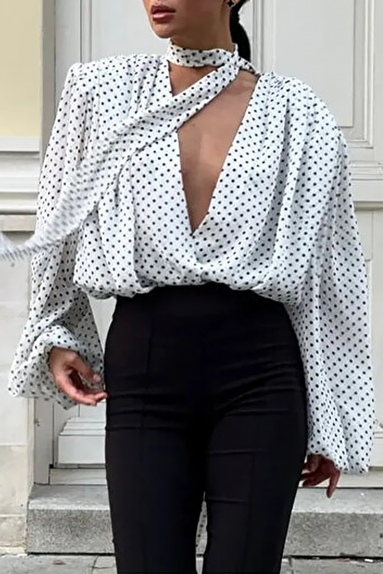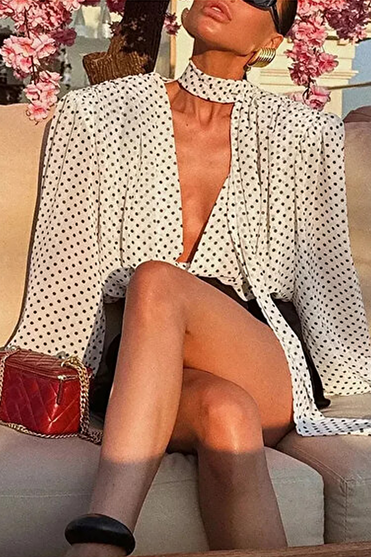 - Sa belom bojom i kontrastnim crnim tačkama, model stvara stilski i nezaboravan izgled. Duboki V-izrezan dekolte i trendi vezivanje napred dodaju sofisticirani karakter i blago smeo akcenat.