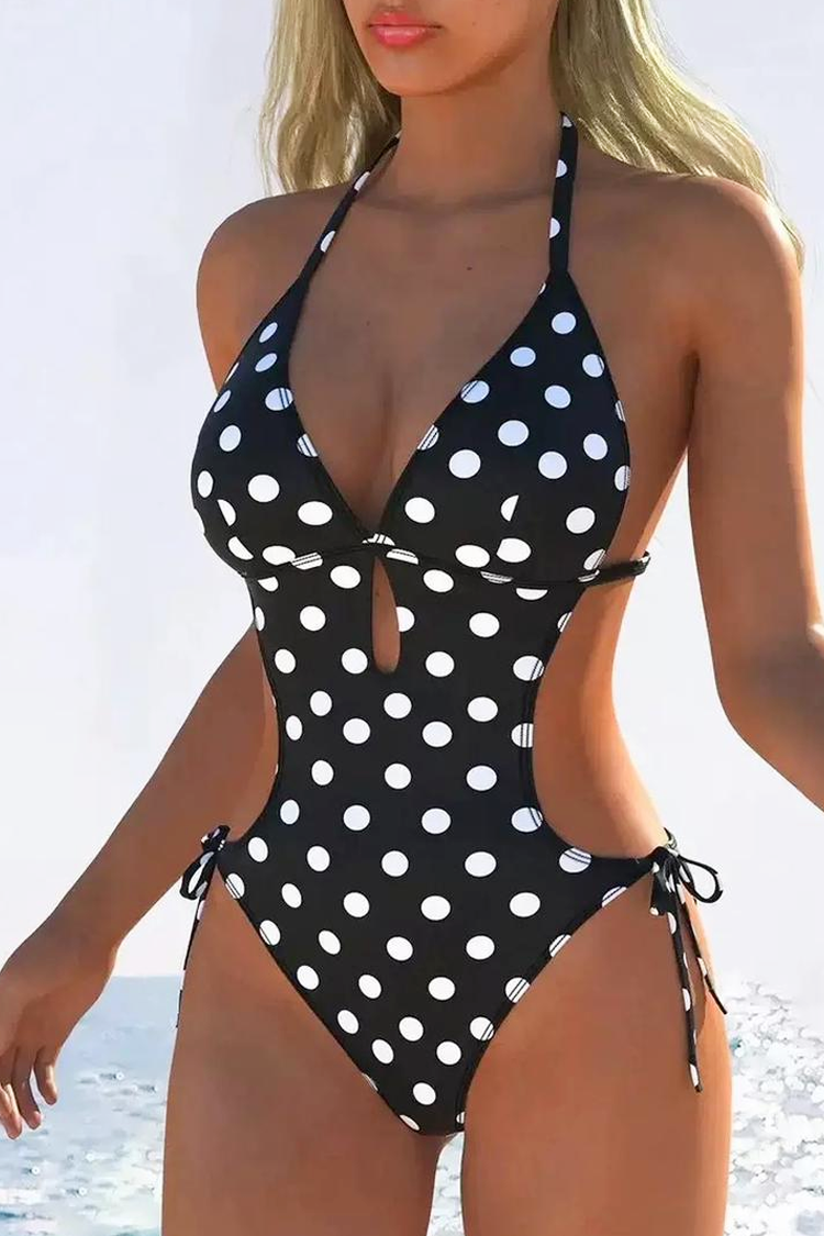 - Ovaj kupaći kostim je smeo i izuzetno ženstven model koji kombinuje retro inspiraciju sa modernom, provokativnom linijom. Klasični beli tufnasti print na crnoj podlozi dodaje bezvremenski šik, dok izrezi sa strane oblikuju siluetu i stvaraju vizuelni efekat viđeg struka.